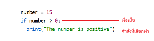 การใช้คำสั่ง if ใน python จะคล้ายกับหลายภาษาคอมพิวเตอร์อื่น ๆ โดยมีการใช้ if ตามด้วยเงื่อนไขแล้วปิดด้วยเครื่องหมาย : และคำสั่งที่ต้องการให้กระทำ ดังรูป