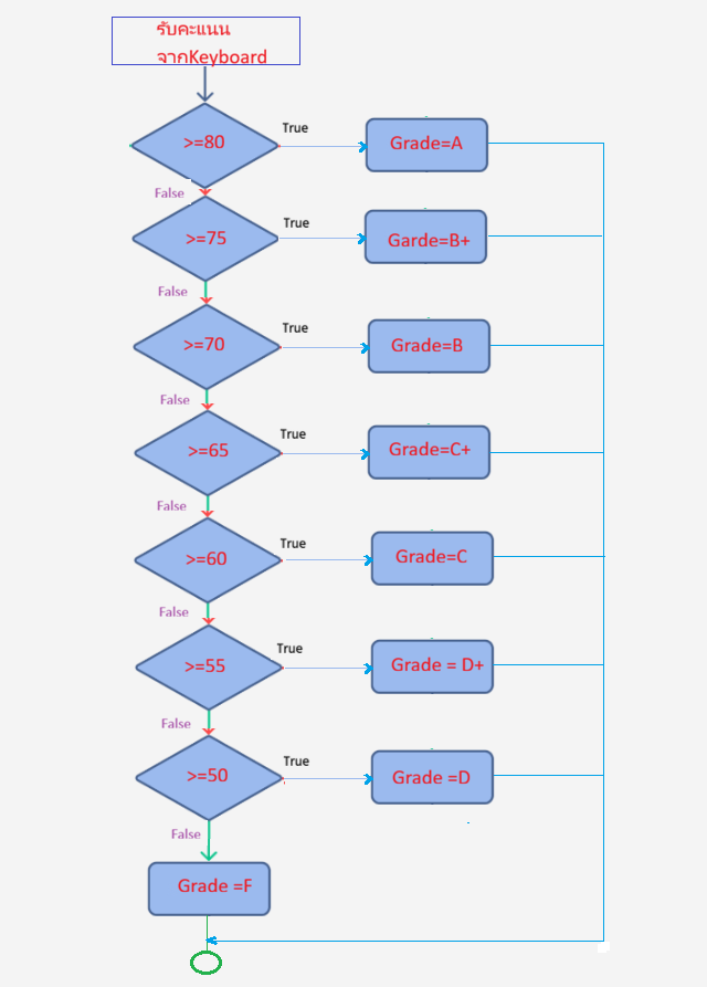 จงเขียนโปรแกรมรับค่าคะแนนจาก Keyboard แล้วตัดสินใจเลือกแสดงผลของระดับเกรดดังลักษณะการทำงานดัง flow chart