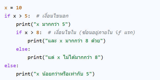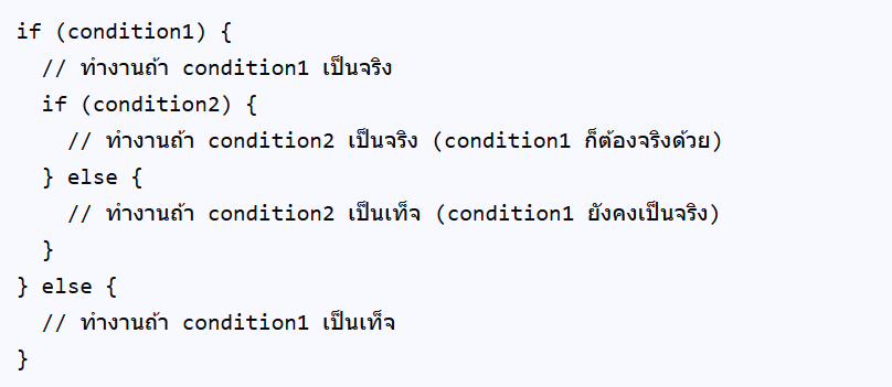 Nested IF (หรือ if ซ้อน if) คือ การนำคำสั่ง if (ถ้า) หลายๆ คำสั่งมาซ้อนกันอยู่ภายในคำสั่ง if อีกที เพื่อสร้างการตัดสินใจที่ซับซ้อนขึ้น โดยโปรแกรมจะตรวจสอบเงื่อนไขแรกก่อน ถ้าเป็นจริงก็จะเข้าไปตรวจสอบเงื่อนไขที่ซ้อนอยู่ข้างในอีกชั้นหนึ่งเรื่อยๆ จนกว่าจะเจอเงื่อนไขที่ตรงตามเงื่อนไข (จริง) จึงจะทำงาน และมีประโยชน์มากในการจัดการกับเงื่อนไขที่ต้องตรวจสอบหลายๆ อย่างต่อเนื่องกัน