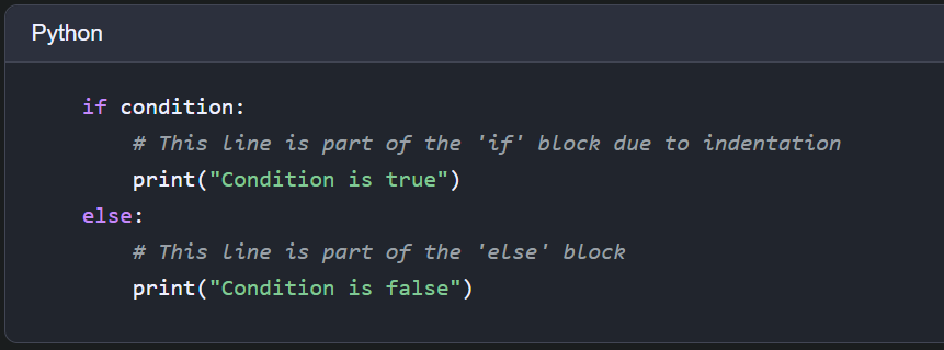Indentation refers to the spaces at the beginning of a code line. Where in other programming languages the indentation in code is for readability only, the indentation in Python is very important. Python uses indentation to indicate a block of code.statements belong to a particular function, loop, conditional statement, or class.