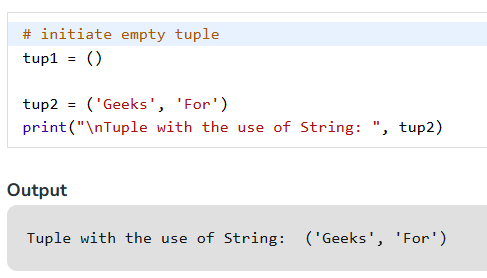 Note:ทูเพิลสามารถสร้างได้ด้วยองค์ประกอบเพียงหนึ่งเดียว แต่ค่อนข้างยุ่งยาก การมีองค์ประกอบเพียงหนึ่งเดียวในวงเล็บไม่เพียงพอ ต้องมีเครื่องหมายจุลภาคปิดท้ายเพื่อให้เป็นทูเพิล