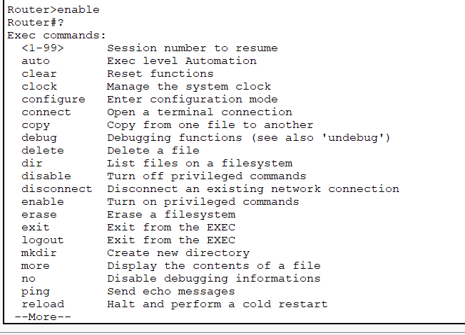 To see the commands available in privileged EXEC prompt, type?.