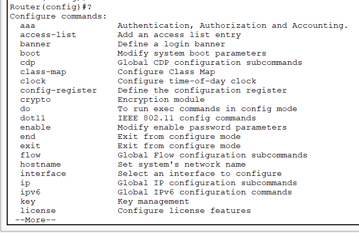 See the commands available in this mode by typing ‘?’. If we need to execute a command not available in the global configuration mode we should prefix the command by “do”.