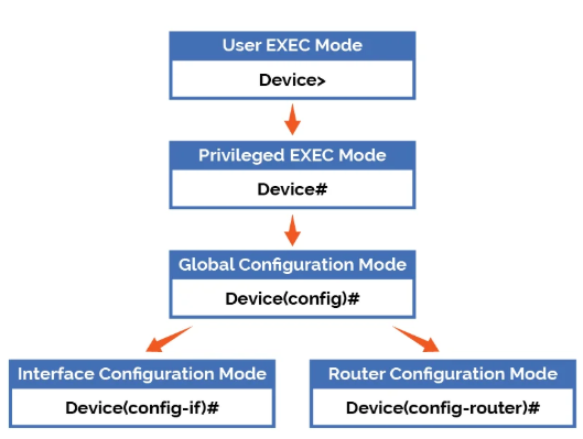The Cisco Command Line Interface (CLI) is a hierarchical structure with several distinct modes, each providing a different set of commands and access levels. The primary modes are