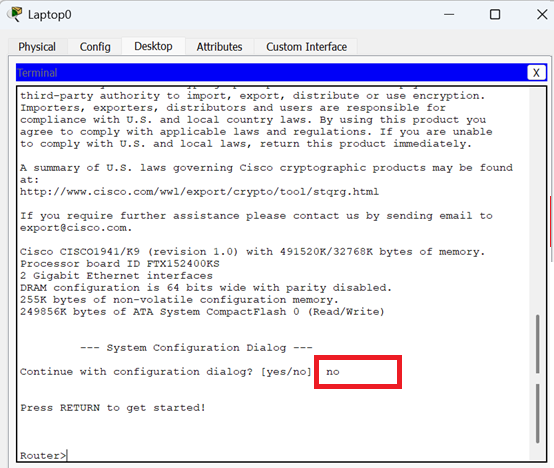 The console opens with the router booting. Router finishes its booting operation and loads into user EXEC mode.