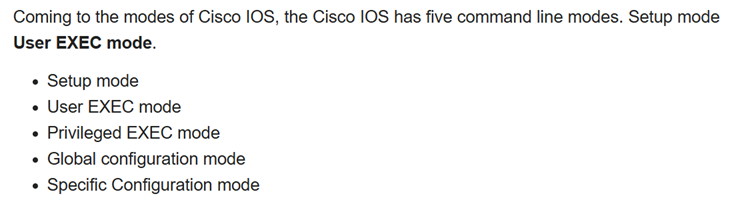 การเข้าใช้งานจะผ่านด่านแต่ละ Mode โดย Mode แรกจะเป็นโหมด User EXEC ซึ่งเป็นโหมดที่ใช้คำสั่งดูข้อมูลพื้นฐานของอุปกรณ์ ยังไม่สามารถคั้งค่าได้ ซึ่งให้สังเกตเครื่องหมายพร๊อม เป็นเครื่องหมาย > หากต้องการเข้าสู่โหมด Privileged EXEC ให้ใช้คำสั่ง enable แล้ว Enter จะเข้าสู่โหมด Privileged EXEC ซึ่งสามารถดูข้อมูลเครือข่ายได้ลึกขึ้น โดยให้สังเกตเครื่องหมายพร๊อมเป็นเครื่องหมาย # และหากต้องการเข้าสู่การคอนฟิกหรือตั้งค่าอุปกรณ์เครือข่าย ต้องเข้าสูโหมด configuration ให้ใช้คำสั่ง configure terminal จะเข้าสู่การตั้งค่าอุปกรณ์เครือข่ายได้