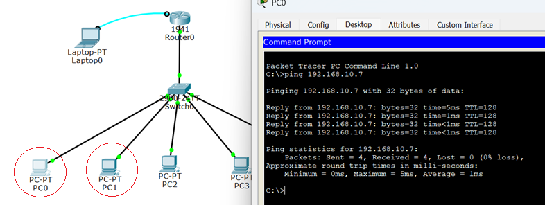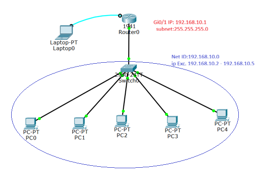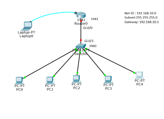 A network topology is created in the Cisco Packet Tracer, which includes a router, a switch, and five host systems connected to a network
