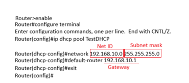 Command Line Interface of the router is accessed and high-lighted commands are executed to successfully configure the DHCP. At first, the ‘IP DHCP pool pool_name’ command is executed. After this, the network address is defined along with its subnet mask. And further, the ‘default-router IP-address’ command is used to define the default route address.