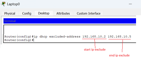 In this step, a range of IP addresses is excluded from the addresses defined in the subnet mask of the DHCP pool. Excluded IP addresses will be not assigned to any host system in the network.