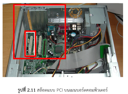 การใช้งานการ์ดเครือข่ายแบบ PCI จะต้องทำการติดตั้งลงบนสล๊อต PCI ของเมนบอร์ดคอมพิวเตอร์และยึดสกรูขันให้เรียบร้อยแล้วทำการติดตั้งไดรเวอร์ของการ์ด ตามขั้นตอนการติดตั้งของแต่ละยี่ห้อ จึงจะสามารถนำไปเชื่อมต่อกับระบบเครือข่าย โดยลักษณะของสล๊อตแบบ PCI บนเมนบอร์ดคอมพิวเตอร์ดังแสดงในรูปที่ 2.11