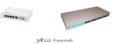 ฮับ (Hub) เป็นอุปกรณ์ตัวกลางสำหรับการเชื่อมโยงเครื่องคอมพิวเตอร์และอุปกรณ์ เครือข่ายอื่นๆเข้าด้วยกัน ลักษณะภายนอกของตัวฮับประกอบด้วยพอร์ต RJ-45 (ฮับบางรุ่นจะมีพอร์ตไฟเบอร์ด้วย) ซึ่งจะใช้เป็นจุดต่อสายสัญญาณไปยังแลนการ์ดของเครื่องคอมพิวเตอร์หรืออุปกรณ์อื่นๆในระบบ ความเร็วการรับส่งข้อมูลของฮับมีตั้งแต่ 10 Mbps และ 100 Mbps มีให้เลือกหลายขนาด ฮับขนาดเล็ก (Small HUB) จะมีจำนวนพอร์ต RJ-45 ประมาณ 4,5,8 ,12 และ 16 พอร์ตเหมาะสำหรับใช้งานในระบบเครือข่ายขนาดเล็กที่มีเครือจำนวนเครื่องคอมพิวเตอร์ไม่มากประมาณ 3 -16 เครื่อง ดังแสดงในรูปที่ 2.12