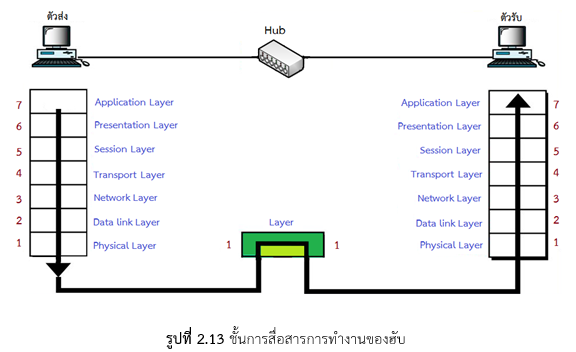 ฮับทำหน้าที่กระจายสัญญาณในระบบเครือข่ายประเภทเดียวกันเท่านั้น คือทำเฉพาะชั้นการสื่อสารฟิสิคัลเท่านั้น ซึ่งเป็นการแปลงข้อมูลเป็นสัญญาณไฟฟ้าไปสู่สื่อกลางเพื่อนำส่งโหนดถัดไปโดยไม่ต้องพิจารณาข้อมูลใดๆ โดยมีลักษณะการทำงานดังแบบจำลอง OSI ดังแสดงในรูปที่ การทำงานจะทำหน้าที่รับและส่งสัญญาณ ไม่มีการเปลี่ยนแปลงข้อมูลก่อนและหลังการรับ-ส่ง ใช้ในระบบเครือข่ายแบบดาว โดยเมื่อรับข้อมูลอะไรเข้ามาก็ส่งข้อมูลนั้นแพร่กระจาย (Broadcast) ออกไปยังทุกๆพอร์ตโดยไม่รู้จุดหมายปลายทางของผู้รับว่าอยู่ที่ใด ผู้ส่งจะส่งข้อมูลผ่านฮับไปยังผู้รับแบบแชร์เส้นทางกันหรือที่เรียกว่าเป็นการแชร์แบนด์วิดท์ (Bandwidth) นั่นเอง จะทำให้เมื่อมีจำนวนคอมพิวเตอร์ต่อกับพอร์ตเพิ่มขึ้นทำให้ความเร็วหรือแบนด์วิดท์จะถูกเฉลี่ยลดลงเท่ากันทุกเครื่อง ขณะที่เครื่องใดอยู่ในระหว่างการสื่อสารส่งข้อมูล เครื่องอื่นๆ ไม่สามารถใช้ช่องสัญญาณเพื่อการสื่อสารในเวลาเดียวกัน และการเชื่อมต่อจากพอร์ตไปยังฮับตัวอื่นๆ เพื่อขยายจำนวนพอร์ตหรือขยายเครือข่ายได้ไม่เกิน 4 ชั้น ดังลักษณะในรูปที่ 2.13