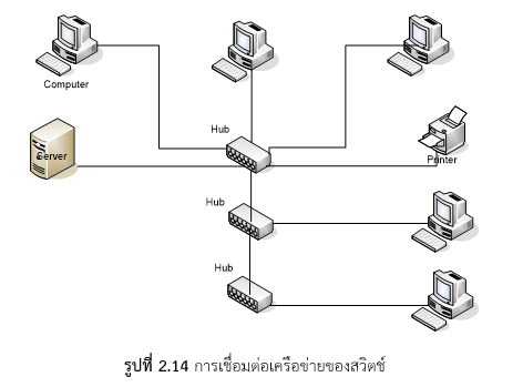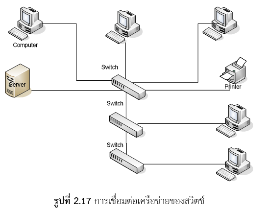 การเชื่อมต่อใช้งานของสวิตช์คล้ายกับฮับ ซึ่งจะใช้พอร์ตเชื่อมต่อแบบ RJ-45 ซึ่งใช้ สายนำสัญญาณประเภทสายยูทีพี ระยะห่างระหว่างสวิตช์และคอมพิวเตอร์หรืออุปกรณ์เครือข่ายต่างๆ มาตรฐานไม่ควรเกิน 100 เมตร สามารถเชื่อมจากพอร์ตไปยังสวิตช์ตัวอื่นๆลงไปเป็นชั้นๆ เพื่อขยายจำนวนพอร์ตได้ไม่จำกัด ดังลักษณะการเชื่อมต่อในรูปที่ 2.17