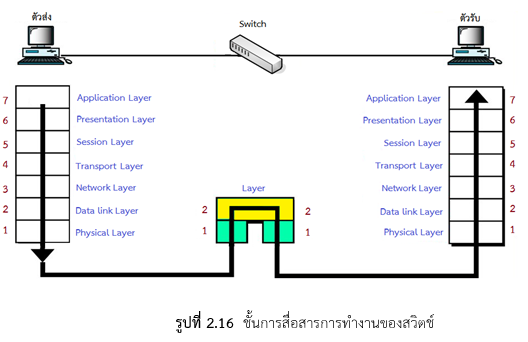 กระบวนทำงานของสวิตช์ มีการสื่อสารถึงระดับชั้นสื่อสารดาต้าลิ้งหรือเลเยอร์ 2 ซึ่งมีความเกี่ยวข้องกับเรื่องของเฟรมข้อมูลและตำแหน่งแม็กแอดเดรสของตัวส่งและตัวรับข้อมูลจากแต่ละพอร์ตดังลักษณะในรูปที่ 2.16