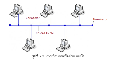 การเชื่อมต่อแบบบัส มีลักษณะการเชื่อมต่อคอมพิวเตอร์และอุปกรณ์ต่าง ๆ ด้วยตัวกลางที่เป็นสายเคเบิ้ลยาวซึ่งจะเป็นสายชนิดโคเอ็กเชียล (Coaxial) ทำหน้าที่นำส่งสัญญาณจากเครื่องคอมพิวเตอร์ตัวส่งไปยังคอมพิวเตอร์ทุกๆเครื่องที่ต่ออยู่กับสายตัวนำ โดยจะใช้คอนเน็กเตอร์เป็นตัวแยกสัญญาณไปยังคอมพิวเตอร์แต่ละเครื่องดังแสดงในรูปที่ 2.2