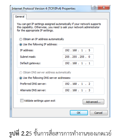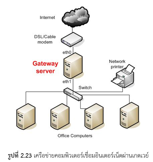 เกตเวย์อาจจะอยู่ในรูปอุปกรณ์แบบฮาร์ดแวร์ที่ผลิตมาทำหน้าที่เป็นเกตเวย์ หรืออุปกรณ์จำพวกโมเด็ม ADSL ก็จะมีเกตเวย์อยู่ภายในตัวเดียวกัน หรืออาจจะเป็นซอฟแวร์ที่ติดตั้งไว้ในเซิฟเวอร์ ดังนั้นในส่วนของลูกข่ายที่จะติดต่อกับเครือข่ายภายนอกนั้นจะต้องระบุช่องทางเกตเวย์ให้ถูกต้องจึงจะสามารถสื่อสารกับระบบภายนอกได้ เช่นการใช้งานอินเตอร์เน็ตนั้นนอกจากต้องกำหนดตำแหน่งหมายเลขลอจิคัลแล้วจะต้องมีการระบุเกตเวย์ให้ถูกต้องได้ จึงจะสามารถสื่อสารกับระบบอินเตอร์เน็ตผ่านทางเกตเวย์ที่กำหนดดังแสดงในรูปที่ 2.25