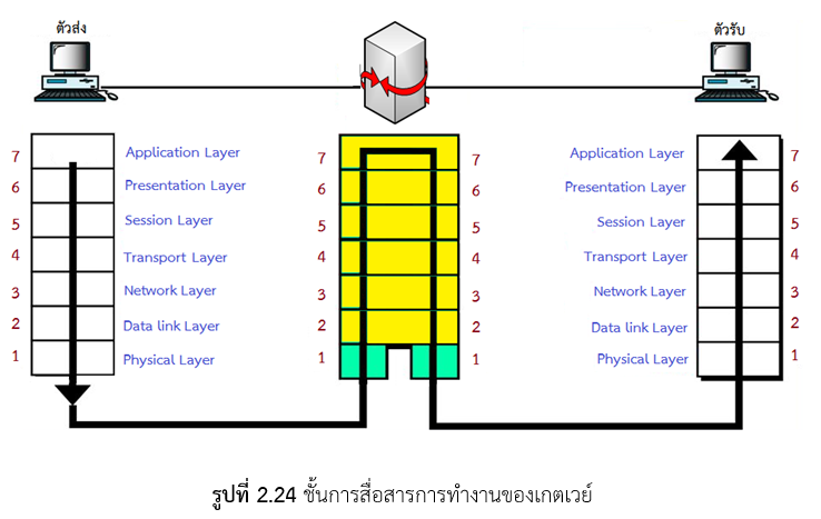 เกตเวย์มีระบบการทำงานได้ทุกชั้นการสื่อสารของแบบจำลองมาตรฐาน OSI ทำให้สามารถเชื่อมต่อการสื่อสารได้ทุกรูปแบบของความแตกต่างระหว่างเครือข่าย ดังลักษณะการทำงานแบบจำลอง OSI ในรูปที่ 2.24