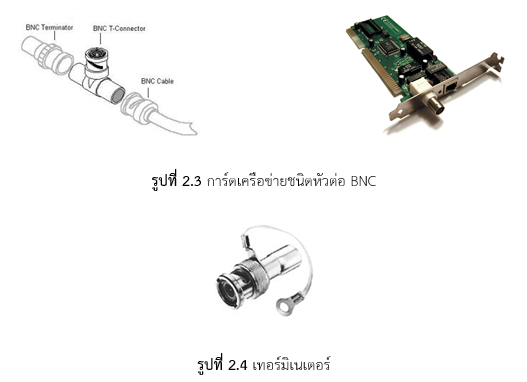 จุดต่อสัญญาณเข้าเครื่องคอมพิวเตอร์แต่ละตัวจะใช้ตัวแยกสัญญาณสามทาง เป็นจุดเชื่อมต่อของสายโคแอคเชี่ยลและการ์ดเครือข่ายของคอมพิวเตอร์ด้วยหัวต่อชนิดบีเอ็นซี (BNC) ดังในรูปที่ 2.3 และปลายสายเคเบิ้ลทั้งสองด้านจะต้องใช้อุปกรณ์ที่เรียกว่าเทอมิเนเตอร์(Terminator) ต่อไว้ เพื่อทำหน้าที่ดูดซับสัญญาณ ป้องกันการสะท้อนกลับของสัญญาณ ดังแสดงในรูปที่ 2.4 (ข) ห้ามไม่ให้นำสายเคเบิลต่อตรงเข้ากับเครื่องที่อยู่ด้านฝั่งหัวและท้ายสุดของสายเคเบิลโดยไม่ใช้ตัวแยกสัญญาณสามทางและเทอมิเนเตอร์ จะทำให้เกิดปัญหาไม่สามารถสื่อสารข้อมูลได้
