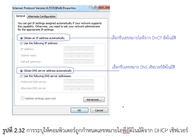 คอมพิวเตอร์และอุปกรณ์สื่อสารทุกๆเครื่องในระบบเครือข่าย ที่ใช้โปรโตคอล TCP/IP จะต้องถูกระบุตำแหน่งด้วยเลขหมายไอพี ซึ่งการระบุเลขหมายไอพีนี้สามารถกำหนดให้เป็นแบบคงตัว คือเลขหมายเดิมทุกๆครั้งที่เชื่อมต่อเครือข่าย หรือแบบให้เครือข่ายเป็นผู้กำหนดเลขหมายไอพีให้อย่างอัตโนมัติ ซึ่งเลขหมายไอพีที่ได้รับจะไม่ใช่เลขหมายเดิมทุกครั้ง ขึ้นกับว่าลำดับเลขหมายไอพีใดว่าง ก็จะถูกจัดสรรมาให้ ซึ่งอุปกรณ์ที่ทำหน้าที่ดูแลแจกจ่ายเลขหมายไอพีให้แก่เครื่องลูกข่ายนั้นคือ DHCP (Dynamic Host Configuration Protocol) เช่นเมื่อเรานำโน๊ตบุ๊คมาเชื่อมต่อสัญญาณ Wi-Fi เพื่อใช้งานอินเตอร์เน็ต ในกระบวนการเริ่มต้นของการเชื่อมต่อนั้นโน๊คบุ๊คจะร้องขอเข้าเครือข่ายและขอเลขหมายไอพี DHCP ก็จะจัดสรรเลขหมายไอพีที่ไม่ซ้ำกับเครื่องอื่นๆ ให้แก่โน๊ตบุ๊คอย่างอัตโนมัติ ทั้งนี้โน๊ตบ๊คหรือคอมพิวเตอร์สามารถระบุได้ว่าจะเลือกกำหนดเลขหมายไอพีเอง หรือเลือกรับเลขหมายไอพีโดยอัตโนมัติ ดังรูปที่ 2.32
