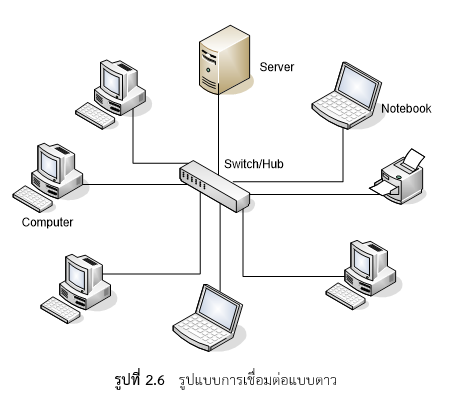การเชื่อมต่อเครือข่ายคอมพิวเตอร์แบบดาว (Topology Star) มีลักษณะที่คอมพิวเตอร์แต่ละตัว เชื่อมต่อเข้ากับอุปกรณ์ที่เป็นจุดศูนย์กลางของเครือข่าย ซึ่งจะทำหน้าที่รับและกระจายสัญญาณ โดยศูนย์กลางกระจายสัญญาณนี้ เรียกว่า ฮับ (Hub) ซึ่งปัจจุบันได้พัฒนาปรับปรุงให้มีความสามารถและความเร็วมาขึ้นเป็นอุปกรณ์ที่เรียกว่า สวิตช์ (Switch) เป็นตัวกลางในการเชื่อมต่อเครือข่าย ผ่านตัวกลางสายชนิดยูทีพี (UTP) เชื่อมต่อกับคอมพิวเตอร์หรืออุปกรณ์เครือต่างๆ ดังลักษณะในรูปที่ 2.6