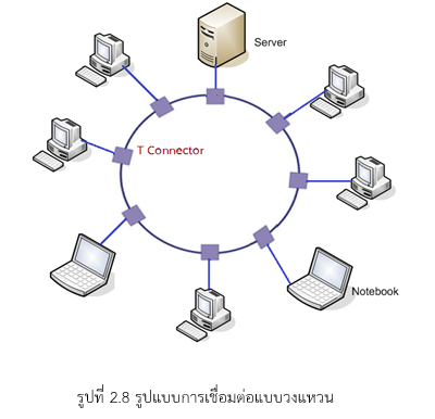 การเชื่อมต่อเครือข่ายคอมพิวเตอร์แบบวงแหวน (ring topology) มีลักษณะการเชื่อมต่อคอมพิวเตอร์ด้วยตัวกลางสายโคแอ็กเชียลเส้นเดียวคล้ายกับการเชื่อมต่อแบบบัส และมีการนำปลายสายมาต่อกันในลักษณะวงแหวน ซึ่งไม่ต้องใช้เทอร์มิเนเตอร์มาทำหน้าที่ดูดซับสัญญาณสะท้อน การรับส่งข้อมูลในโครงข่ายจะวนส่งข้อมูลไปในทิศทางเดียวเท่านั้นโดยใช้วิธีการส่งข้อมูลแบบการส่งผ่านโทเค็น (Token Passing) ซึ่งหากเครื่องใดต้องการส่งข้อมูลจะต้องรอข้อมูลโทเค็น เพื่อเป็นการกำหนดให้เป็นตัวส่งข้อมูล ดังนั้นหากเครืองใด้รับโทเค็นก็จะทำหน้าที่ส่งข้อมูลไปให้กับเครื่องคอมพิวเตอร์ที่อยู่ลำดับถัดไป คอมพิวเตอร์ตัวถัดไปก็จะนำเฟรมข้อมูลมาตรวจเช็คหากไม่ใช้หมายเลขปลายทางของตัวเองก็จะส่งต่อไปให้คอมพิวเตอร์เครื่องถัดไป ซึ่งจะเป็นขั้นตอนอย่างนี้ไปเรื่อยๆ จนกว่าจะข้อมูลไปถึงคอมพิวเตอร์ปลายทางที่ถูกระบุตามที่อยู่ ทั้งนี้การรับและส่งต่อข้อมูลของแต่ละเครื่อง จะมีลักษณะเป็นการทวนสัญญาณให้มีสภาพดีไปในตัว เมื่อถึงคอมพิวเตอร์ปลายทาง เครื่องคอมพิวเตอร์ปลายทางจะสำเนาข้อมูลไว้แล้วส่งต่อไปยังเครื่องถัดไป จนกระทั่งข้อมูลกลับมาถึงตัวส่ง จะทำให้เครื่องตัวส่งทราบได้ทันทีว่าข้อมูลที่ส่งไปถึงตัวรับปลายทางเรียบร้อยแล้ว และเครื่องคอมพิวเตอร์จะส่งโทเค็นให้เครื่องถัดไป เพื่อเปิดโอกาศให้คอมพิวเตอร์เครื่องอื่นได้เป็นตัวส่งบ้าง ซึ่งรูปแบบการเชื่อมต่อเครือข่ายแบบวงแหวนมีลักษณะดังในรูปที่ 2.8