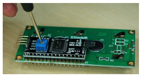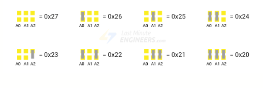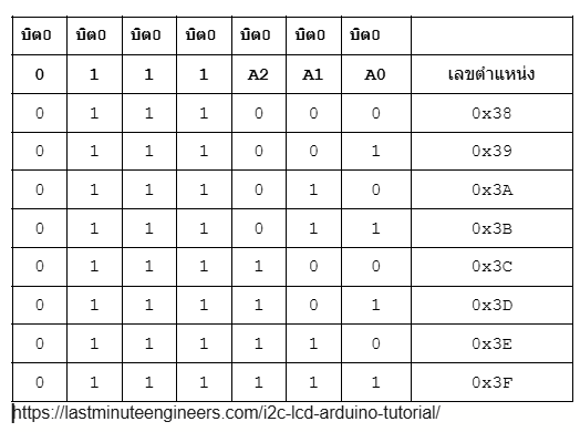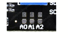 โดยบนแผ่นวงจร PCB ของโมดูล I2C ควบคุม LCD จะมีขาจั้มเปอร์ไว้ให้กำหนดตำแหน่ง 3 ขา หรือ 3 บิต คือขา A0 A1 A2 ดังรูป ซึ่งสามารถกำหนดตำแหน่งแตกต่างได้ 8 ตำแหน่ง โดยแต่ละขาของ A0 A1 A2 จะต่อความต้านทานไปยังไฟเลี้ยง (Pull Up)