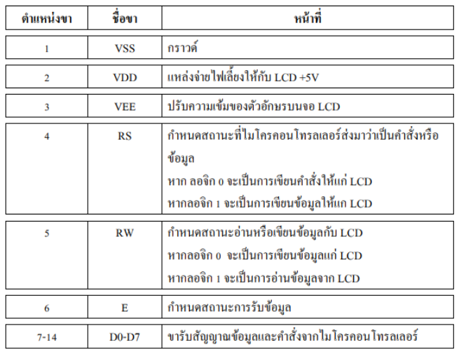 3) ชุดควบคุม ( Controller ) เป็นตัวรับข้อมูลและคำสั่งมาจากไมโครคอนโทรลเลอร์เพื่อควบคุม LCD ให้สามารถแสดงผล เป็นตัวอักษร ต่าง ๆ การลบ การเลื่อนตัวอักษร เป็นต้น สำหรับการเรียนรู้การแสดงด้วย LCD ในเอกสารนี้ จะใช้ตัวแสดงผล LCD แบบตัวอักษร ขนาด 16 อักษร 2 บรรทัด ซึ่งมีลักษณะและตำแหน่งขาดังในรูปที่